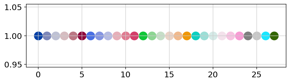 plt.scatter(i, 1, c=sc.pl.palettes.zeileis_28[i], s=200)