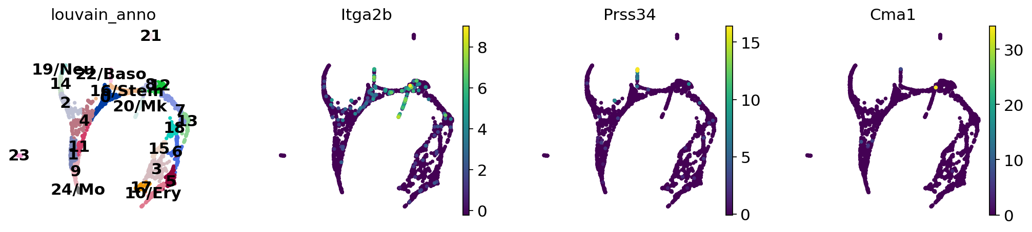 sc.pl.draw_graph(adata, color=["louvain_anno", "Itga2b", "Prss34", "Cma1"], legend_loc="on data")