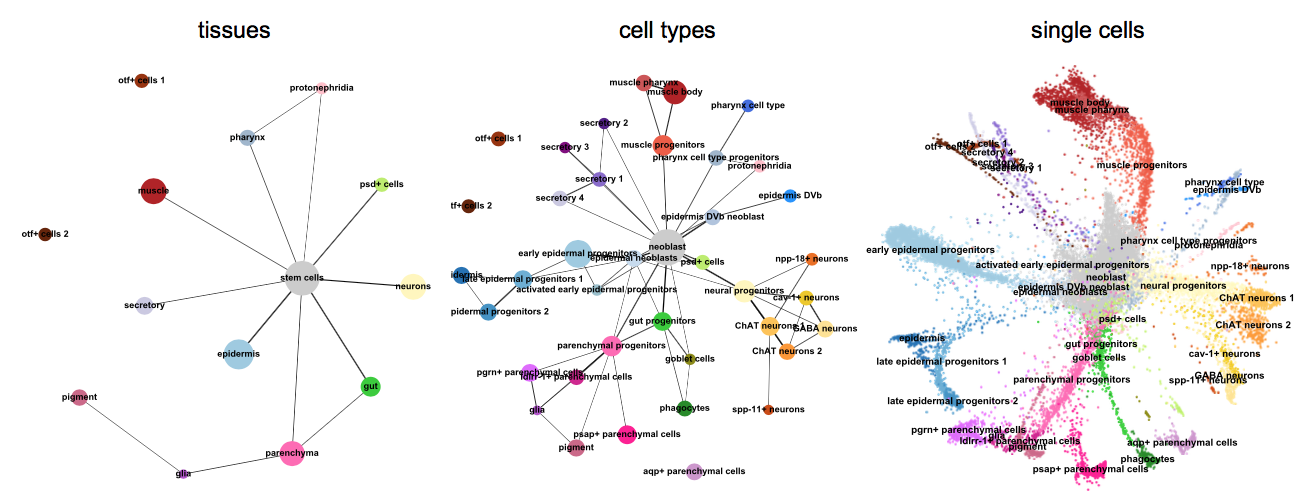 More examples for trajectory inference on complex datasets can be found in the PAGA repository [Wolf et al., 2019], for instance, multi-resolution analyses of whole animals, such as for planaria for data of Plass et al. [2018].